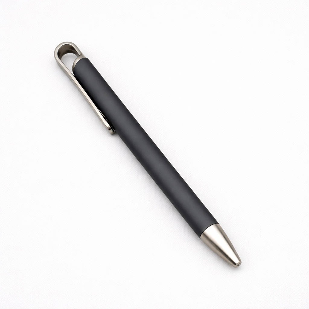 Bolígrafo metálico con acabado rubber (suave al tacto), diseño moderno y elegante, ideal para uso corporativo y promocional.
